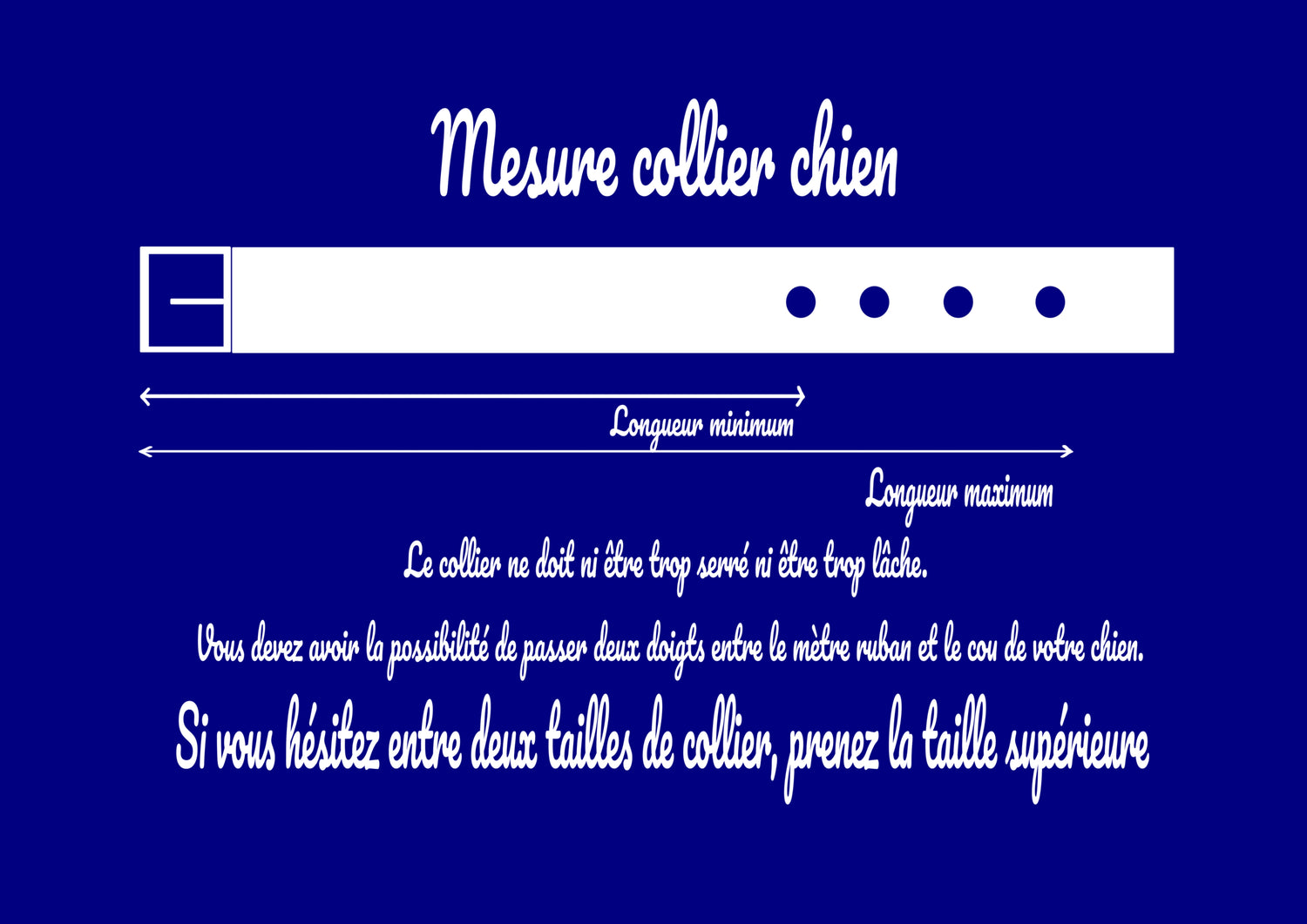- Assurez-vous que le mètre ne soit ni trop serré ni trop lâche. Vous devez avoir la possibilité de passer deux doigts entre le mètre et le cou de votre chien.